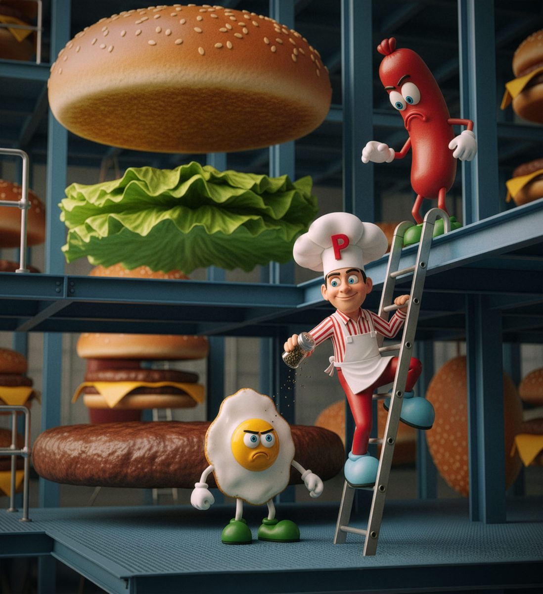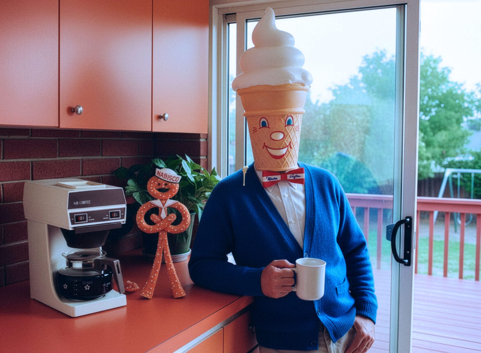 Since the novelty of achieving looks faded, I’ve focused on more creative scenarios, first replacing backgrounds for amusement or irony, posing people, and changing their clothes, a la Robot Chicken. I’ve especially enjoyed bringing illustrated characters like brand mascots to life. Photographic experience helps me craft more compelling images through composition, re-lighting, and point of view. Some results in this next gallery hold up as their own works, making them a bit like memes. (They also didn’t fit my other categories.)